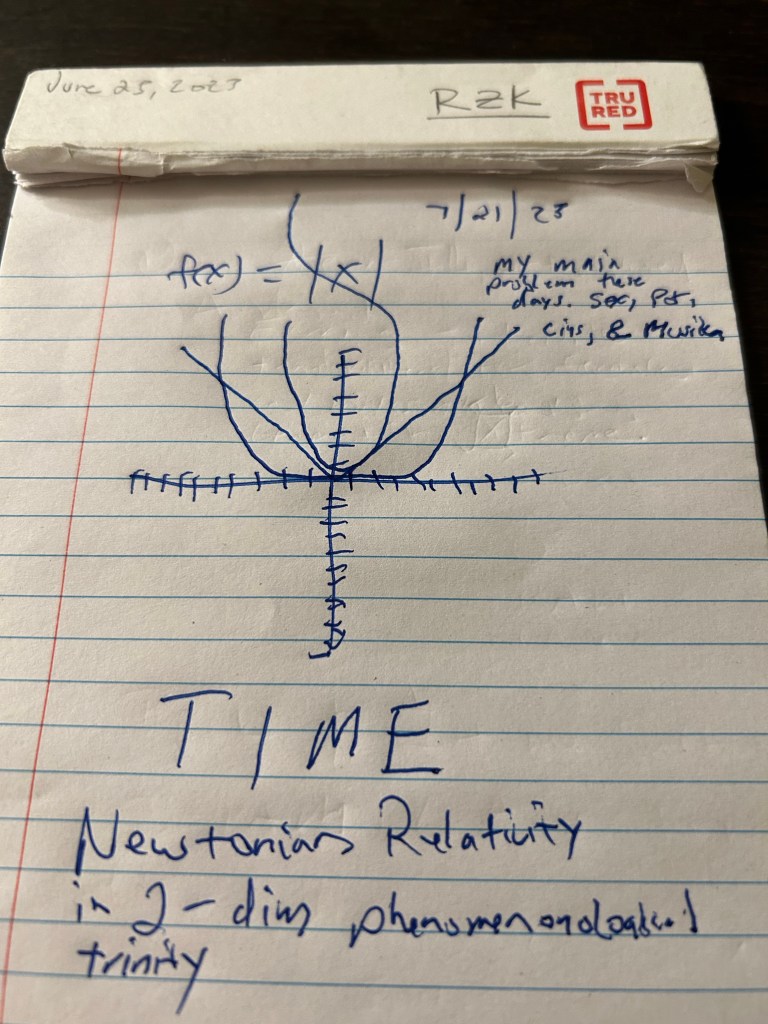 Or it could be a combination of the former three depending on a person’s mental developmental traits and progression which it itself relative to either genetical differences or inherent cultural needs. It could be seen in terms of both Newtonian and Einsteinian illustrations or illuminations to make it just verbal for explanation brevity. To be specific in two dimension I mean a flattened parabola where the flat part is Newt and the entry curves and the exponential vertical asymptotes are generally Einian and remnants of the former. So at the asymptotes where it increases fast vertically whichever which way time comes to a halt and if it crosses the X-axis, then I don’t know (probably another dimension, who knows?) Now, that is the most simplistic form of understanding Time (and I don’t mean man-made). Time to me is invisible without a clock but thru time I KNOW it is there by experience in the mirror of age-ity. [Jump} Can time go in reverse at the cross point that at the x-axis for example or what happens does it inverse or something. I was told that given enuf space it crosses known to my math professor, Ramsey, at Santa Monica College where I was challenged by a suit at the final {I didn’t show a serious medical reason that healed itself, but completed the class with some disappointment}.